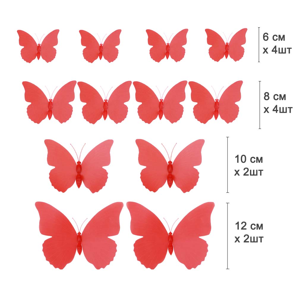 Бабочки на булавке 12 шт пластик красные