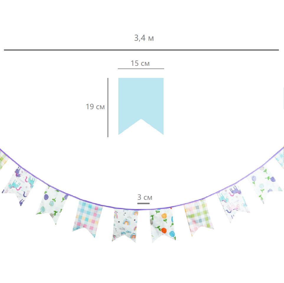 Гирлянда состоит из 12 флажков, общая длина составляет 3,4 м, расстояние между флажками 3 см, длина матерчатых флажков 2,1 м, длина лямок с обеих сторон по 50 см