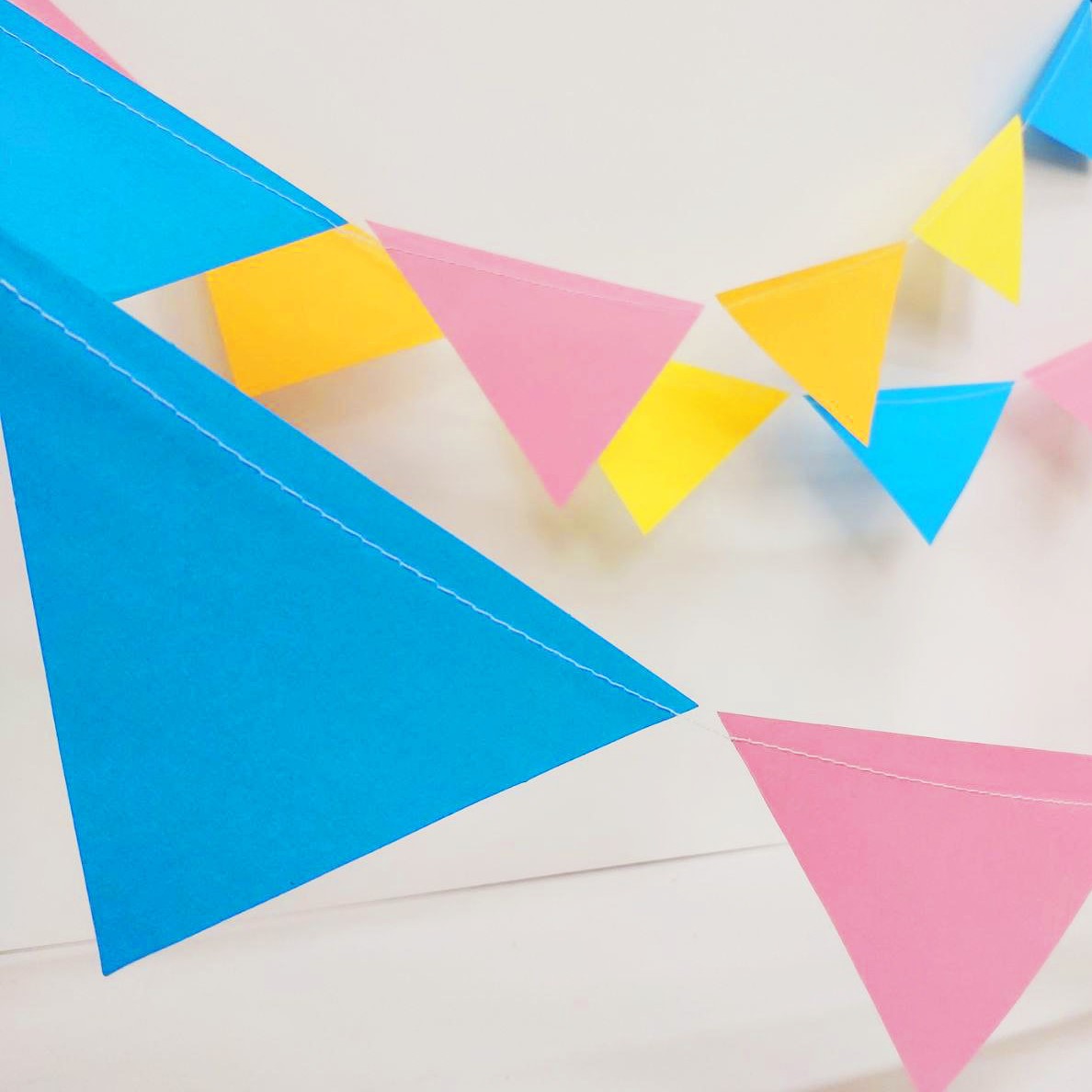 Декоративная гирлянда в форме вымпела, декорированная красочными бумажными двусторонними треугольниками.