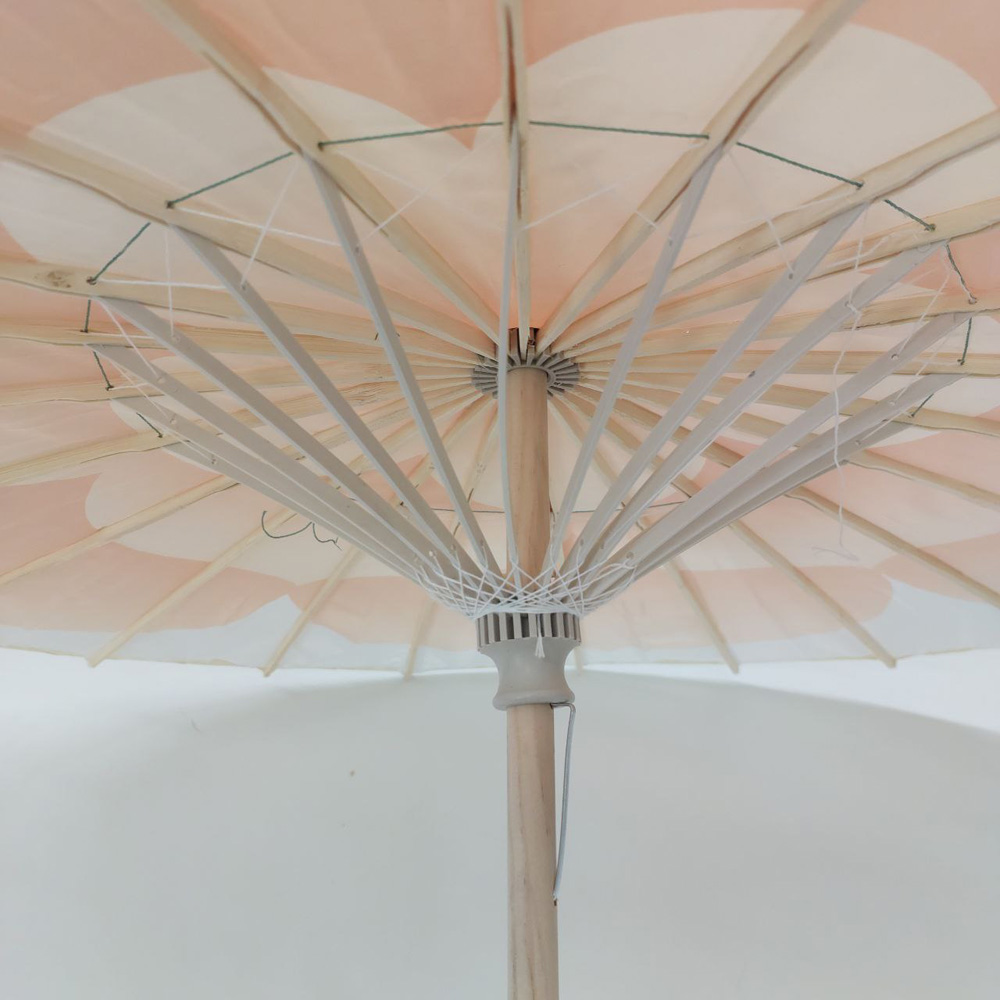 Каркас зонтика выполнен из дерева,купол зонта изготовлен из водоотталкивающего материала,который не пропускает воду.