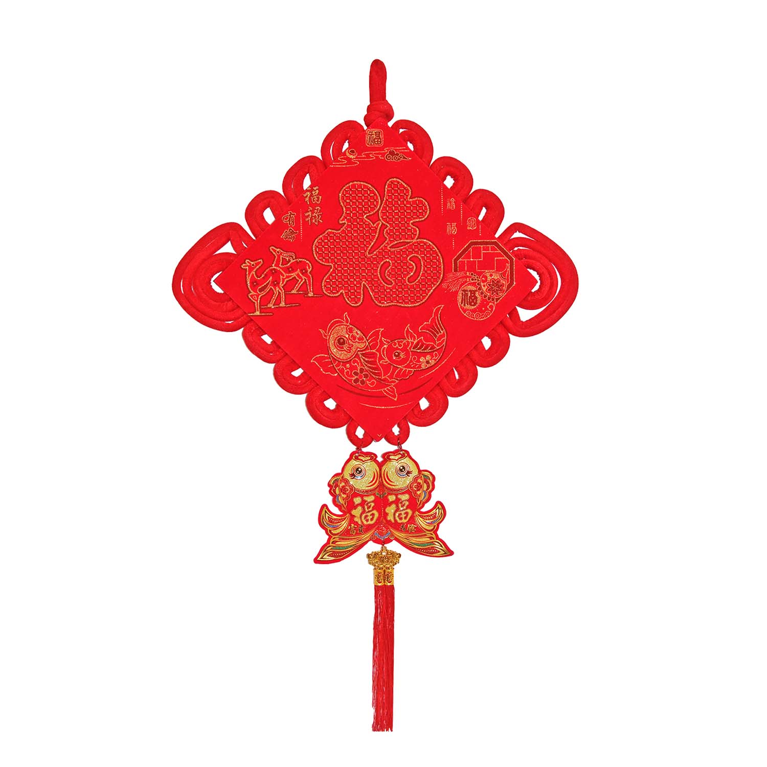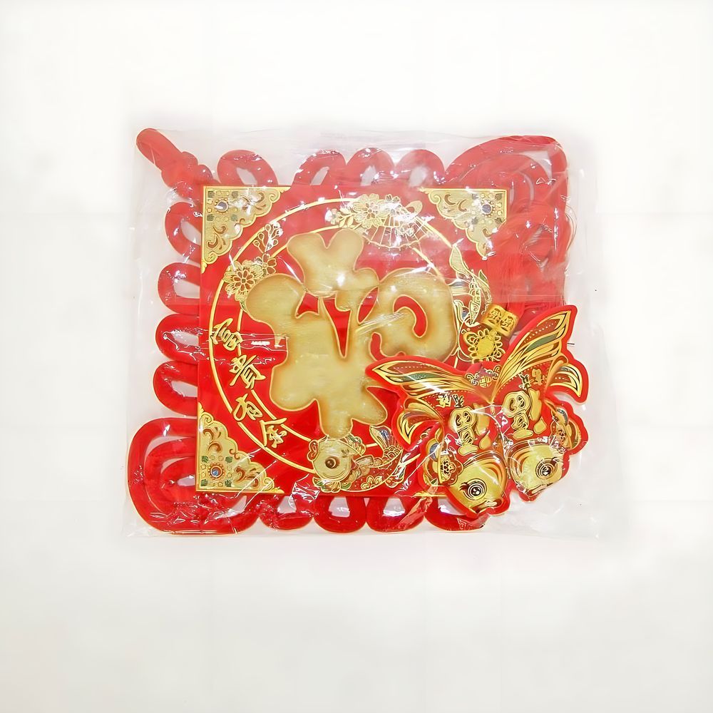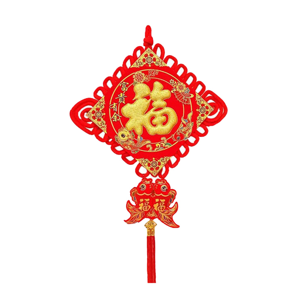 Традиционный китайский узел в форме ромба с символичным дизайном. Яркое сочетание красного бархата и золотых элементов создает эффектный акцент в интерьере.