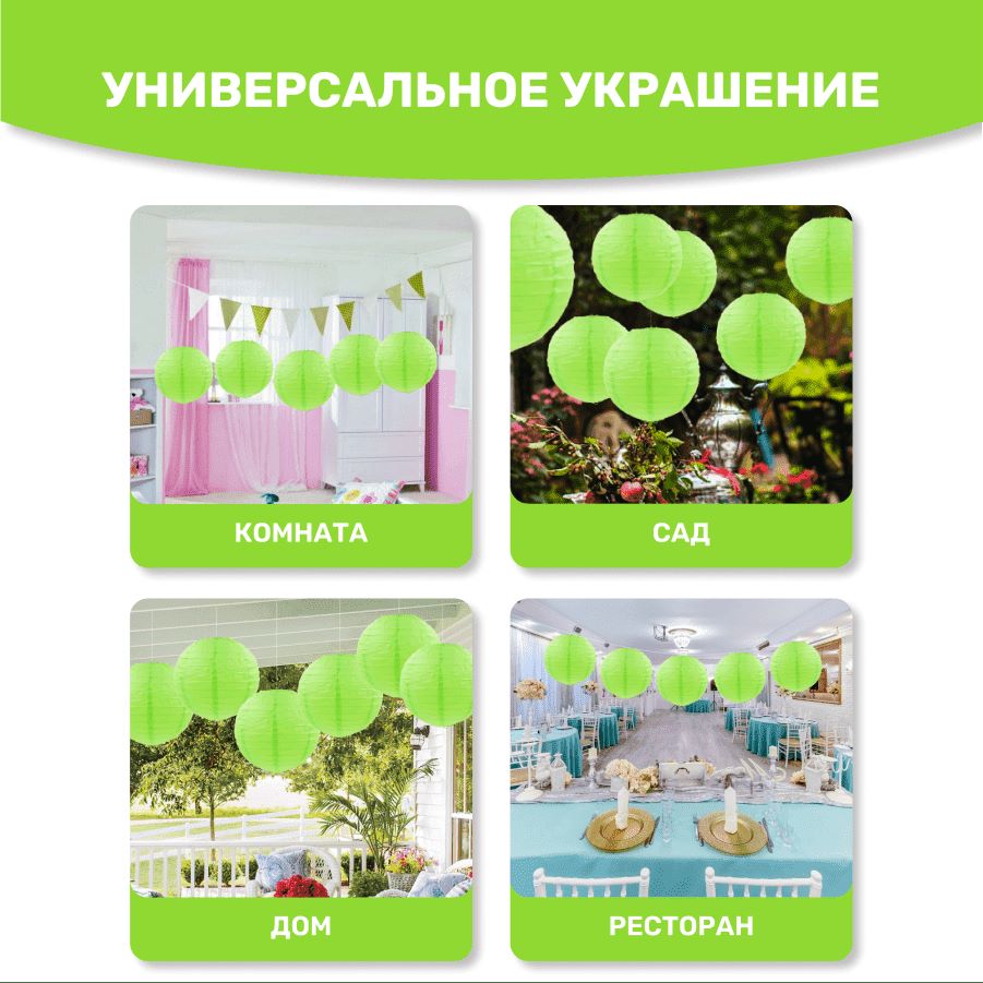 В комплект входит 8 бумажных фонариков и лента атласная.