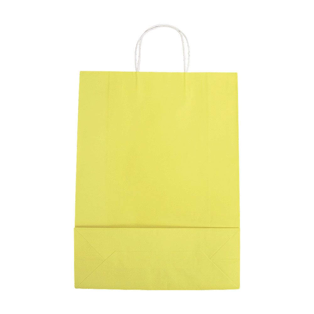 Подарочный пакет из крафтовой бумаги пастельного оттенка с белыми бумажными ручками и белой внутренней стороной.