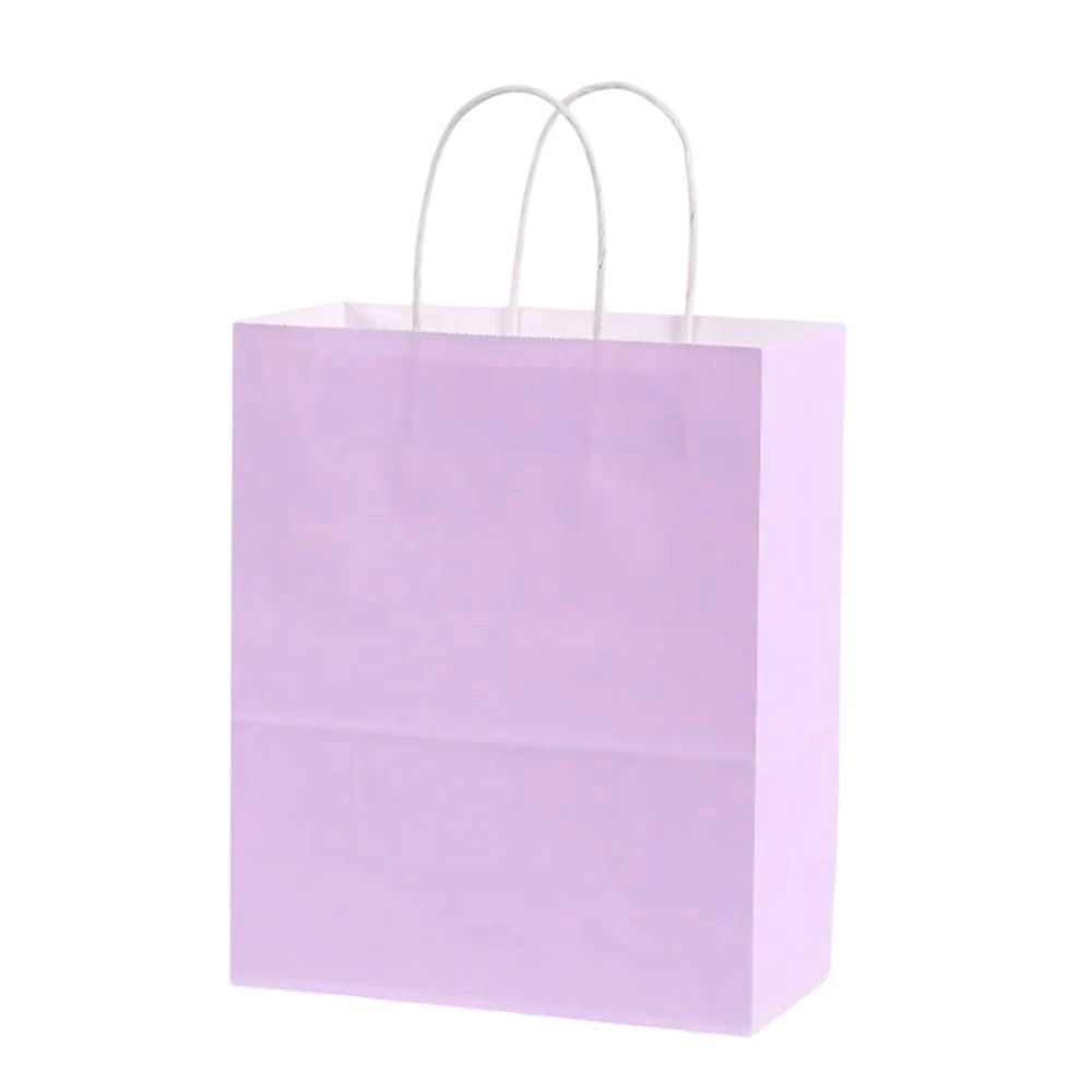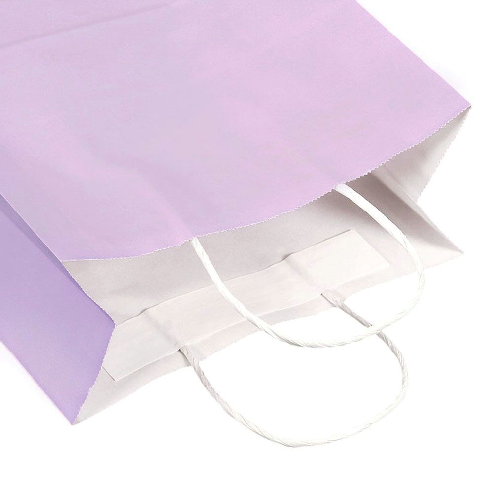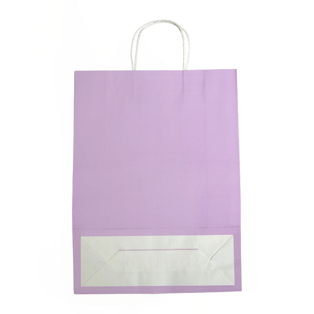 Подарочный пакет из крафтовой бумаги пастельного оттенка с белыми бумажными ручками и белой внутренней стороной.