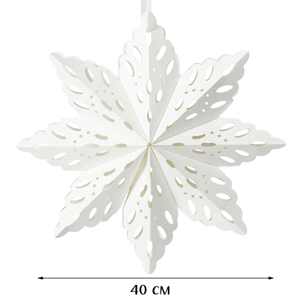 Элегантная объёмная снежинка из плотной бумаги белого цвета — изысканное украшение для зимнего интерьера, витрин, залов и новогодних фотозон. Ажурный рисунок придаёт ей лёгкость и воздушность, создавая ощущение снежной свежести и уюта.