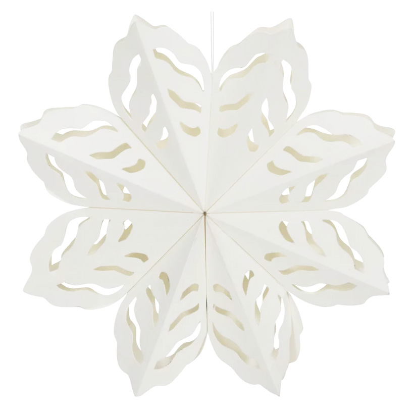 Элегантная объёмная снежинка из плотной бумаги белого цвета — изысканное украшение для зимнего интерьера, витрин, залов и новогодних фотозон. Ажурный рисунок придаёт ей лёгкость и воздушность, создавая ощущение снежной свежести и уюта.