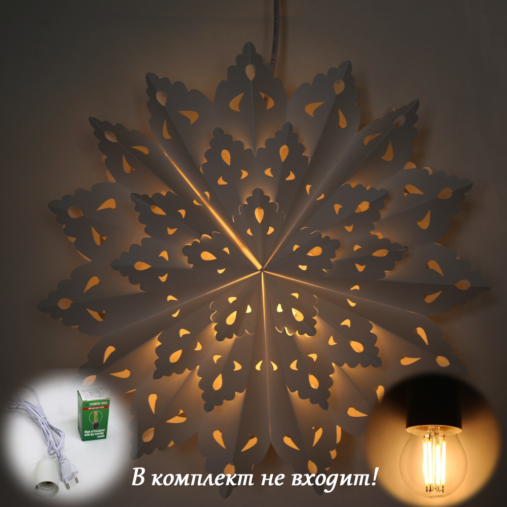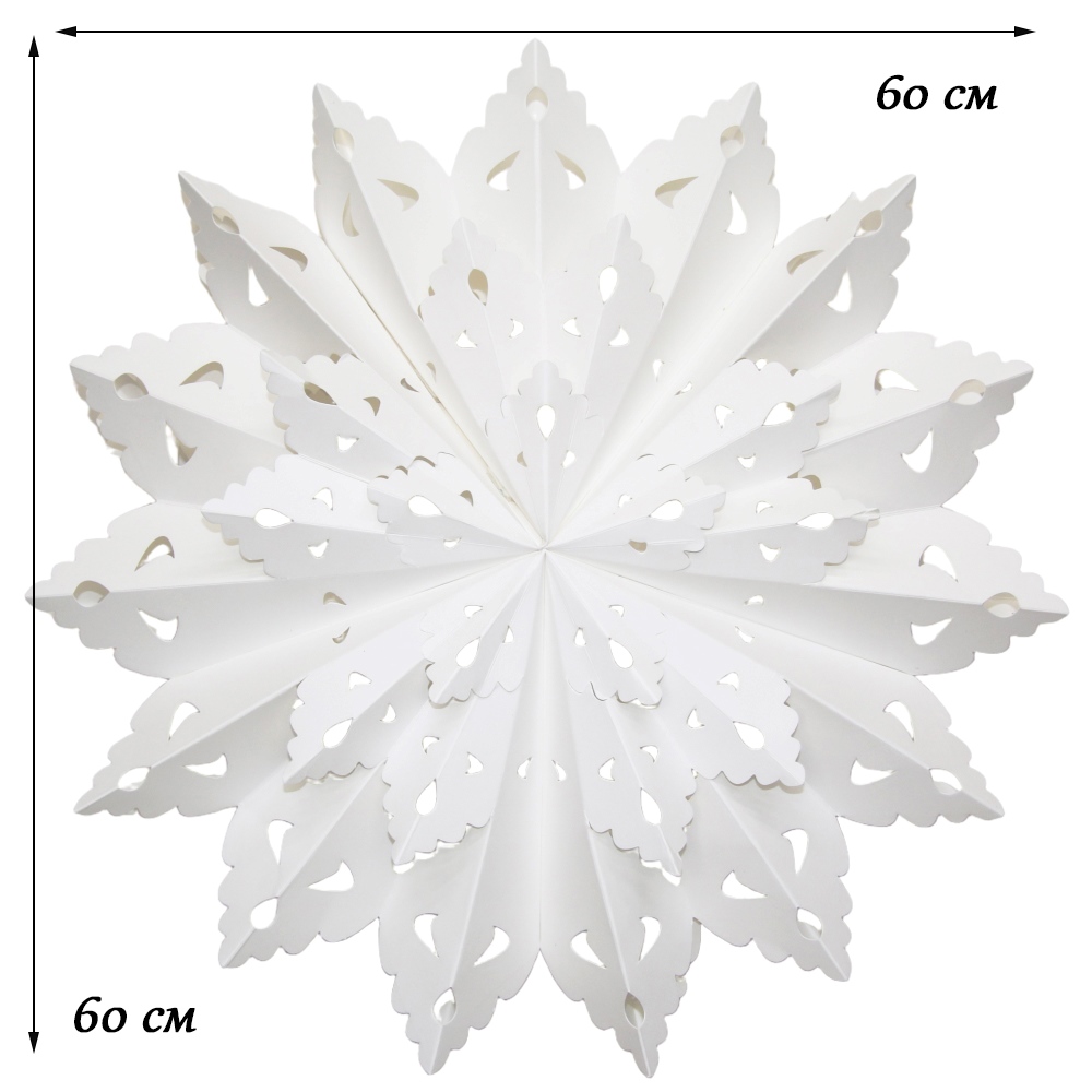 Снежинка на липучках размером 60 см, белого цвета, изготовлена из высококачественной бумаги.
