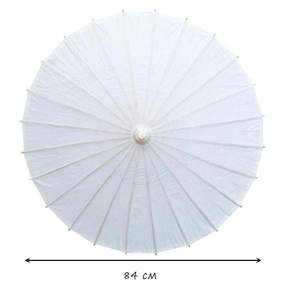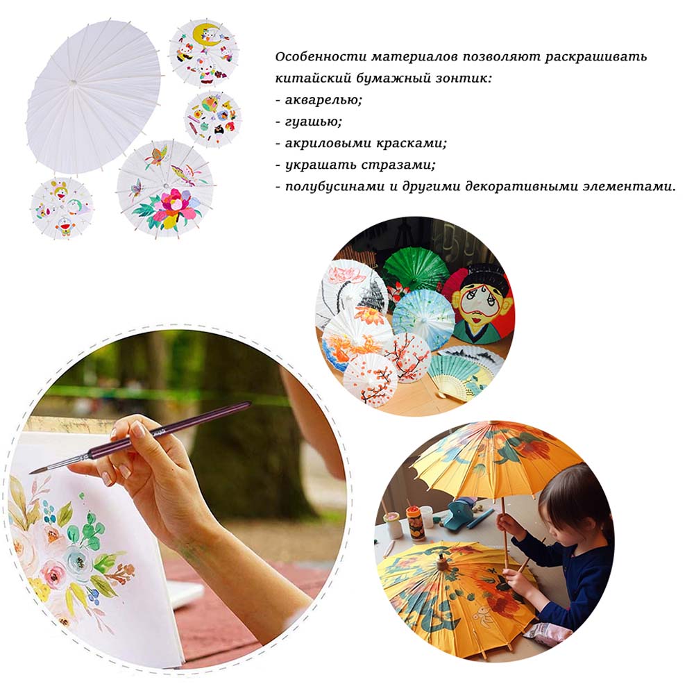 Раскрашенный и украшенный зонт китайский бумажный подходит для создания фотозоны, свадебного оформления, дополнения тортов. Также декоративный зонтик используют в качестве аксессуара для самодельных кукол и создания театральных декораций.