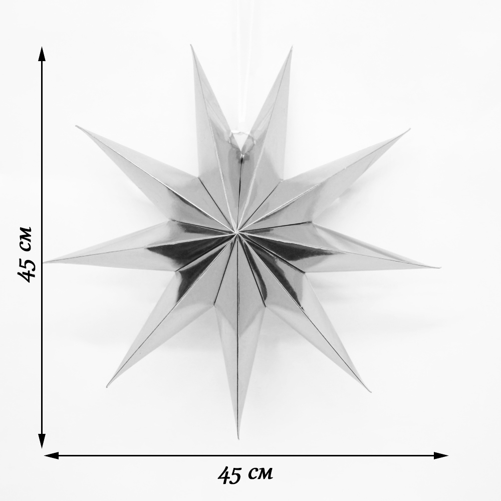Объёмная девятиконечная звезда 45 см — декоративный элемент для интерьера и праздничного оформления. Лёгкая интерьерная звезда из картона хорошо держит форму и создаёт выразительный объём. Поставляется в сложенном виде, в комплекте шнур для фиксации объёма и подвеса.
